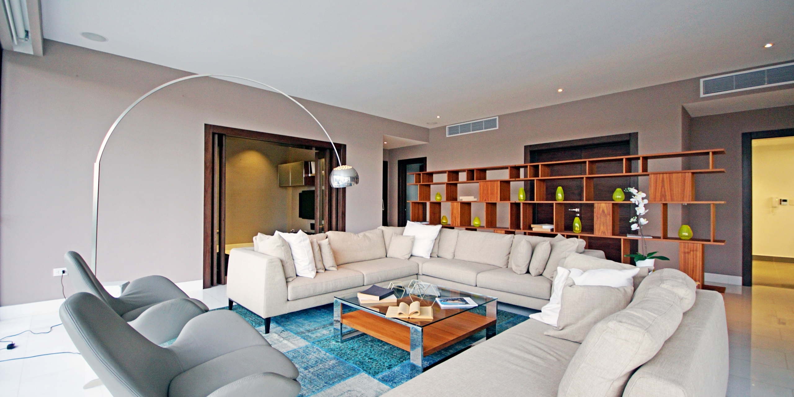 Cada apartamento cuenta con la siguiente distribución: tres habitaciones con sus baños, habitación principal con dos walking closets, dos closets de ropa blanca, 3.5 baños, sala, comedor, estudio, estar familiar, cocina principal, despensa, cocina secundaria, terraza techada, área de servicio, cuarto de servicio con su baño, tres parqueos techados y un locker. Además, la torre cuenta con parqueos adicionales disponibles para la venta (en caso de que algún otro propietario precise alguno).