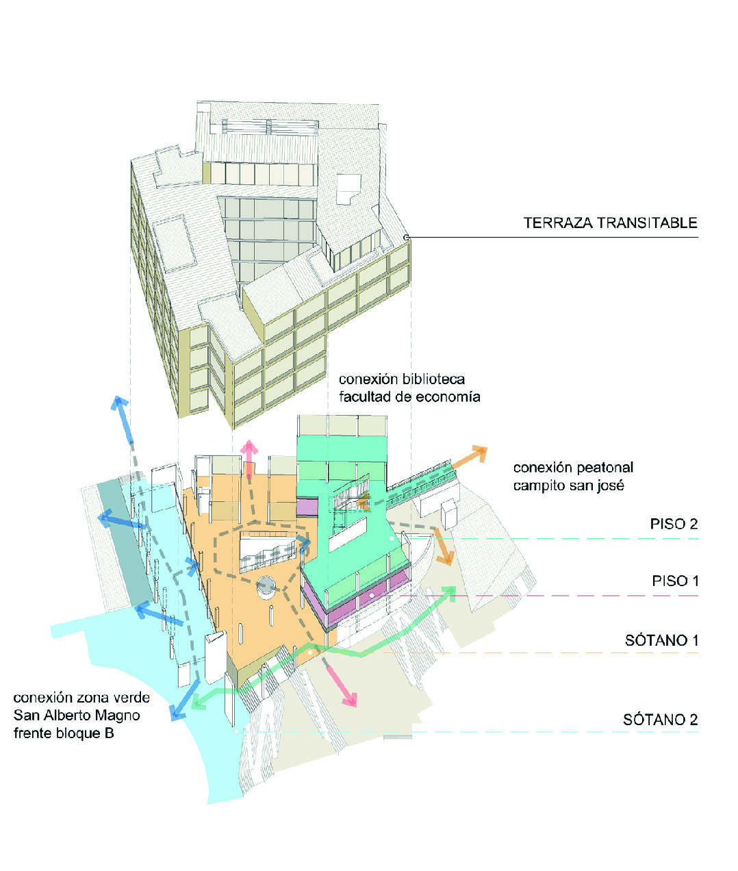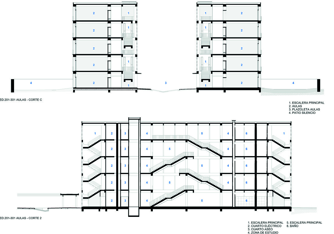 como horizontal (sur-norte) del campus: Es un conector en diferentes niveles