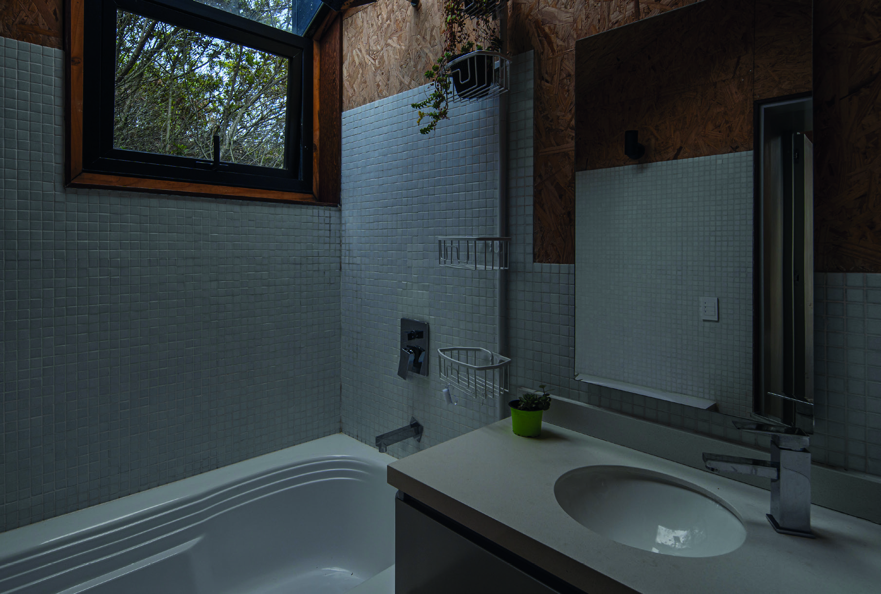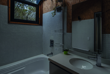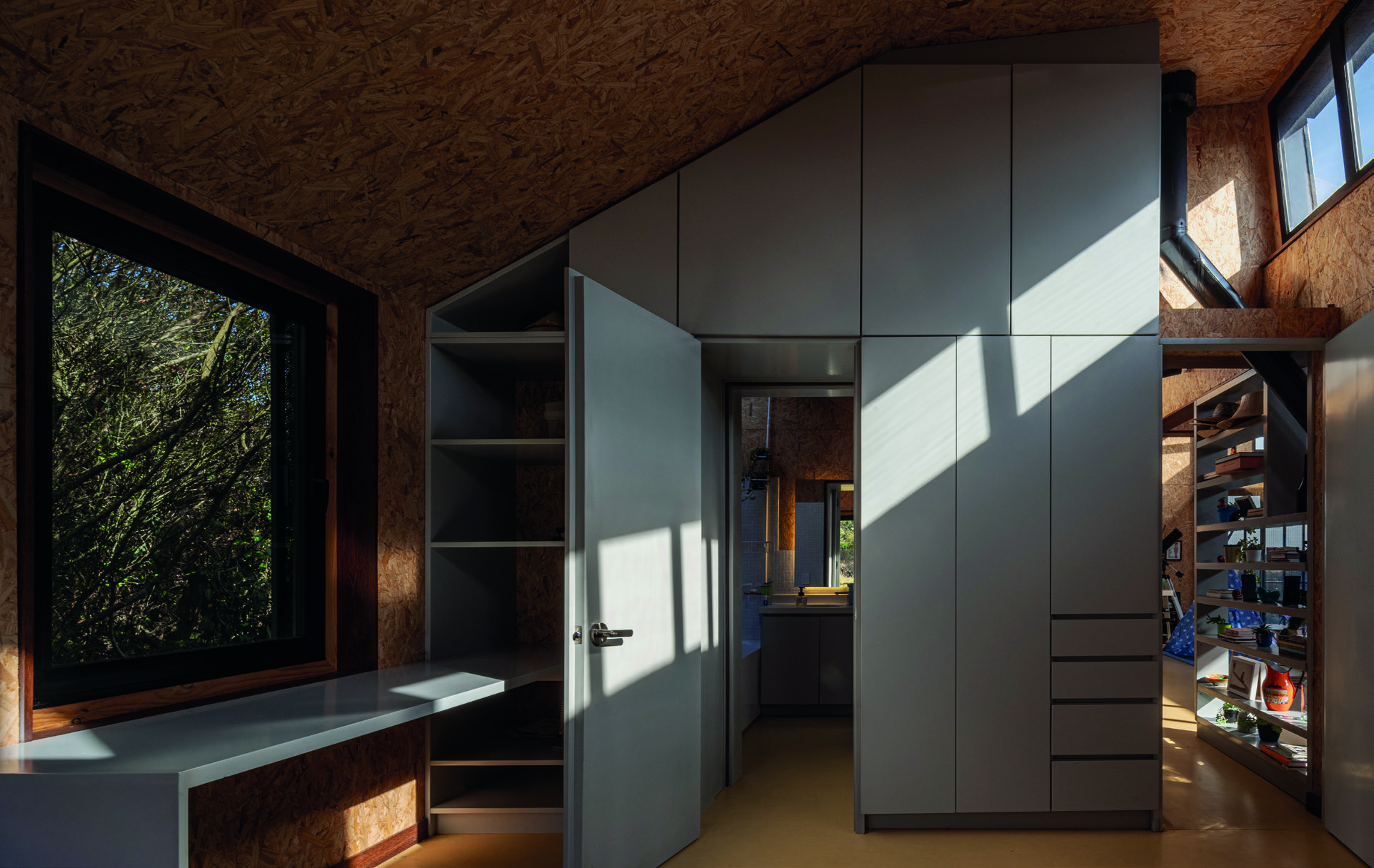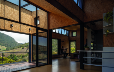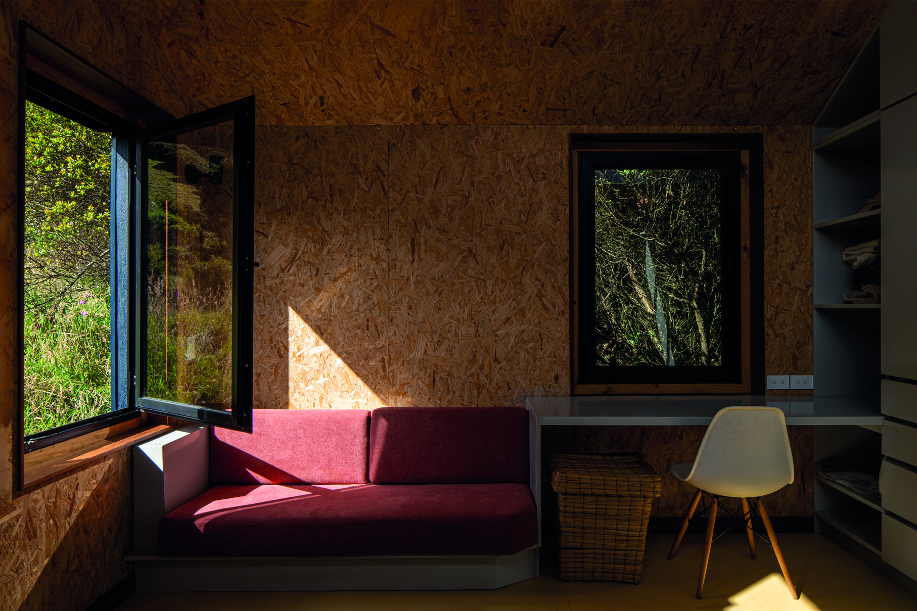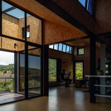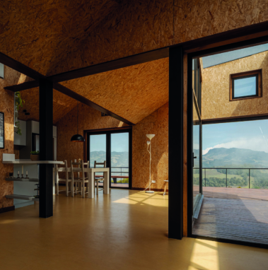 paneles de madera OSB que en complemento con un suelo en vinilo de color