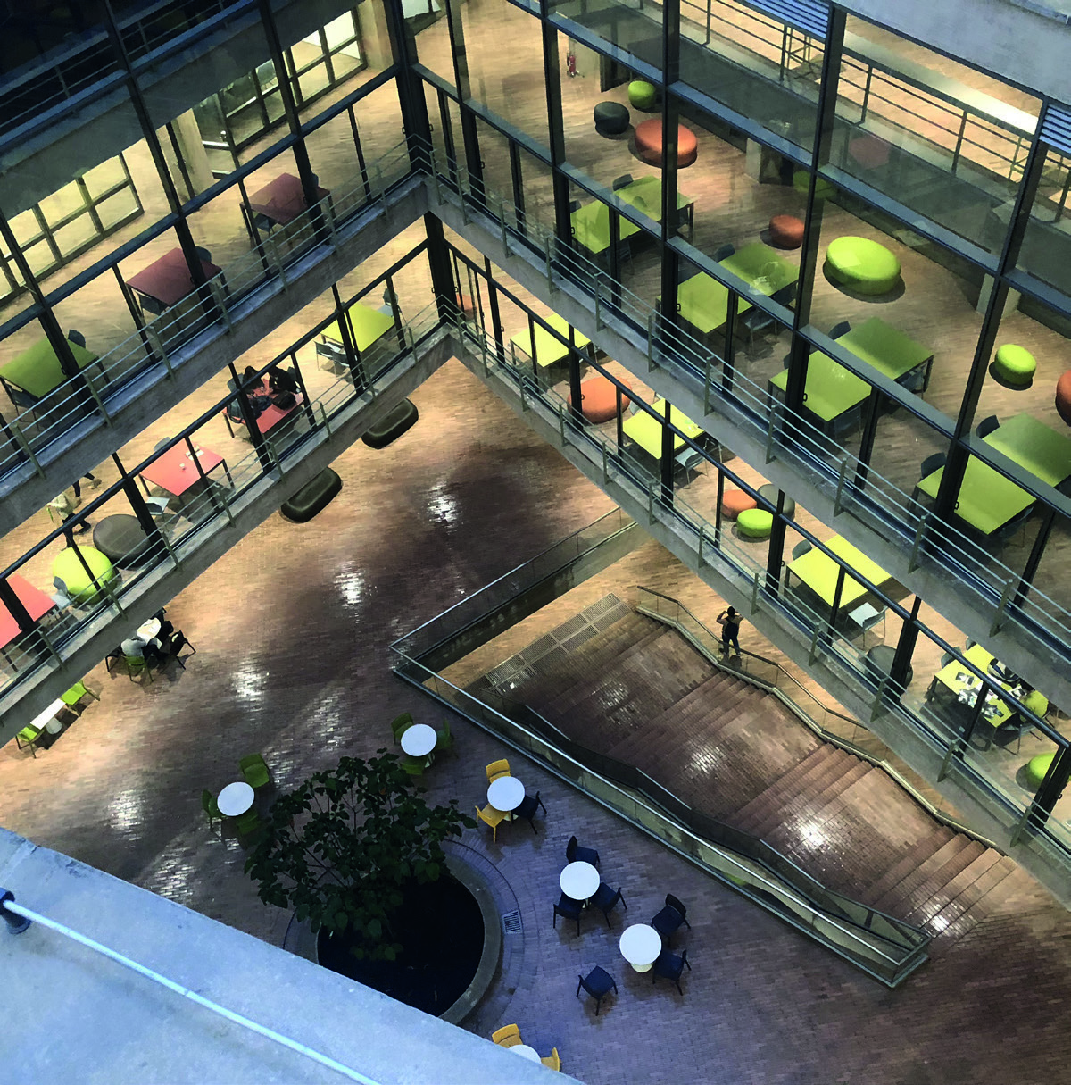 través de escaleras mecánicas que se mueven por todo el edificio mezclando los
