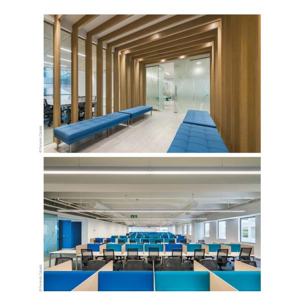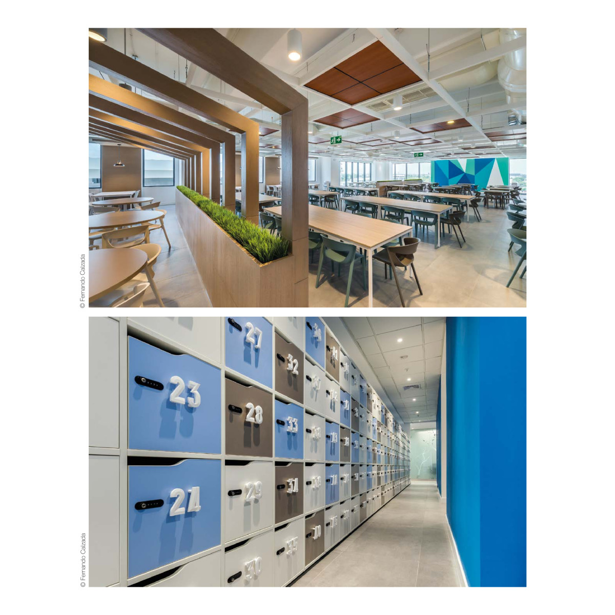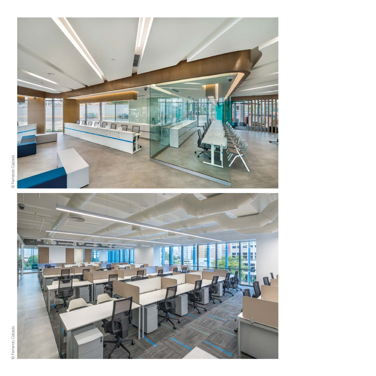 Ambos volúmenes poseen una planta libre que puede adaptarse según las necesidades de la empresa. En un primer nivel se concentran todas las áreas de acceso al público general, comercial y de atención al cliente además de un dispensario médico para servicio a empleados, conectados por un patio interior y una gran escalinata de acceso principal. En el segundo nivel se desarrollan las funciones de operaciones, reclamaciones y auditoría médica. En el tercer nivel el área de riesgos generales, técnico de vida y calidad, combinado con los salones de reuniones generales del edificio y el puente que conecta el edificio de parqueos. En el cuarto nivel se ubican el call center y la Vicepresidencia de operaciones, por último, en el quinto nivel se encuentran las áreas de comedor y breakroom de los empleados con terraza y techo verde.