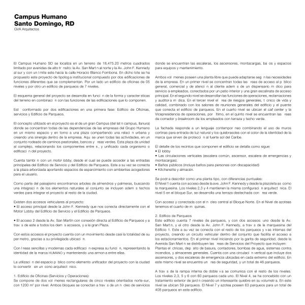 El Campus Humano SD se localiza en un terreno de 18,475.20 metros cuadrados limitado por avenidas de alto tránsito: la Av. San Martín al norte y la Av. John F. Kennedy al sur y con un límite este hacia la calle Horacio Blanco Fombona. En dicho lote se ha propuesto este proyecto de tipología institucional compuesto por dos edificaciones de funciones diferentes que se complementan. Por un lado un edificio de oficinas de 05 niveles y por otro un edificio de parqueos de 7 niveles.