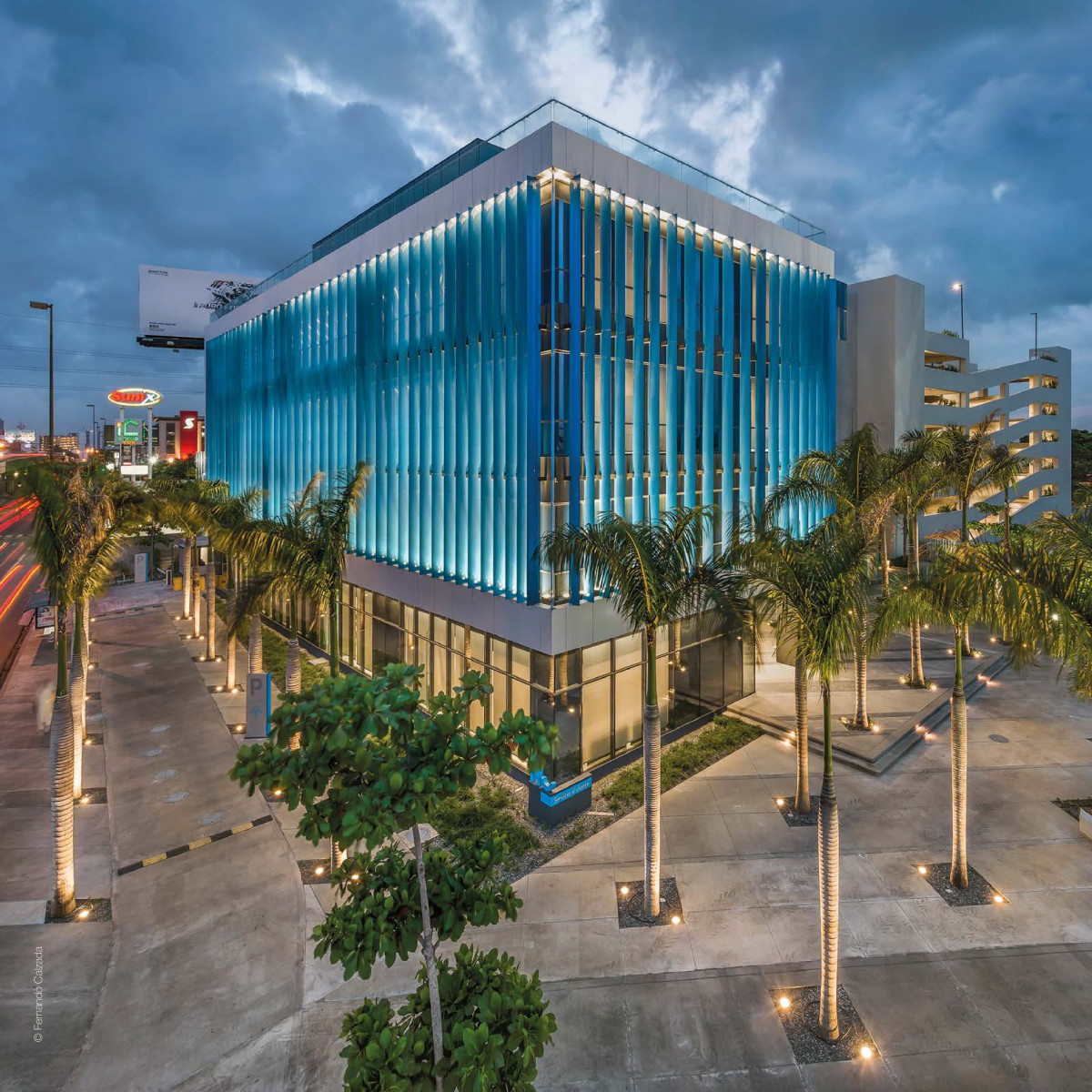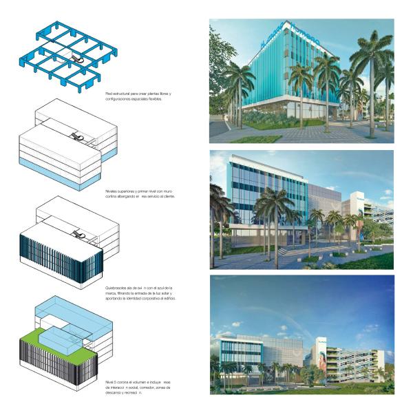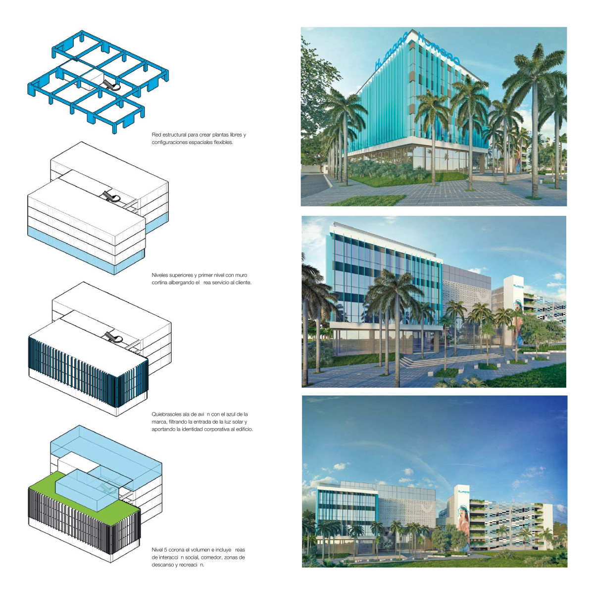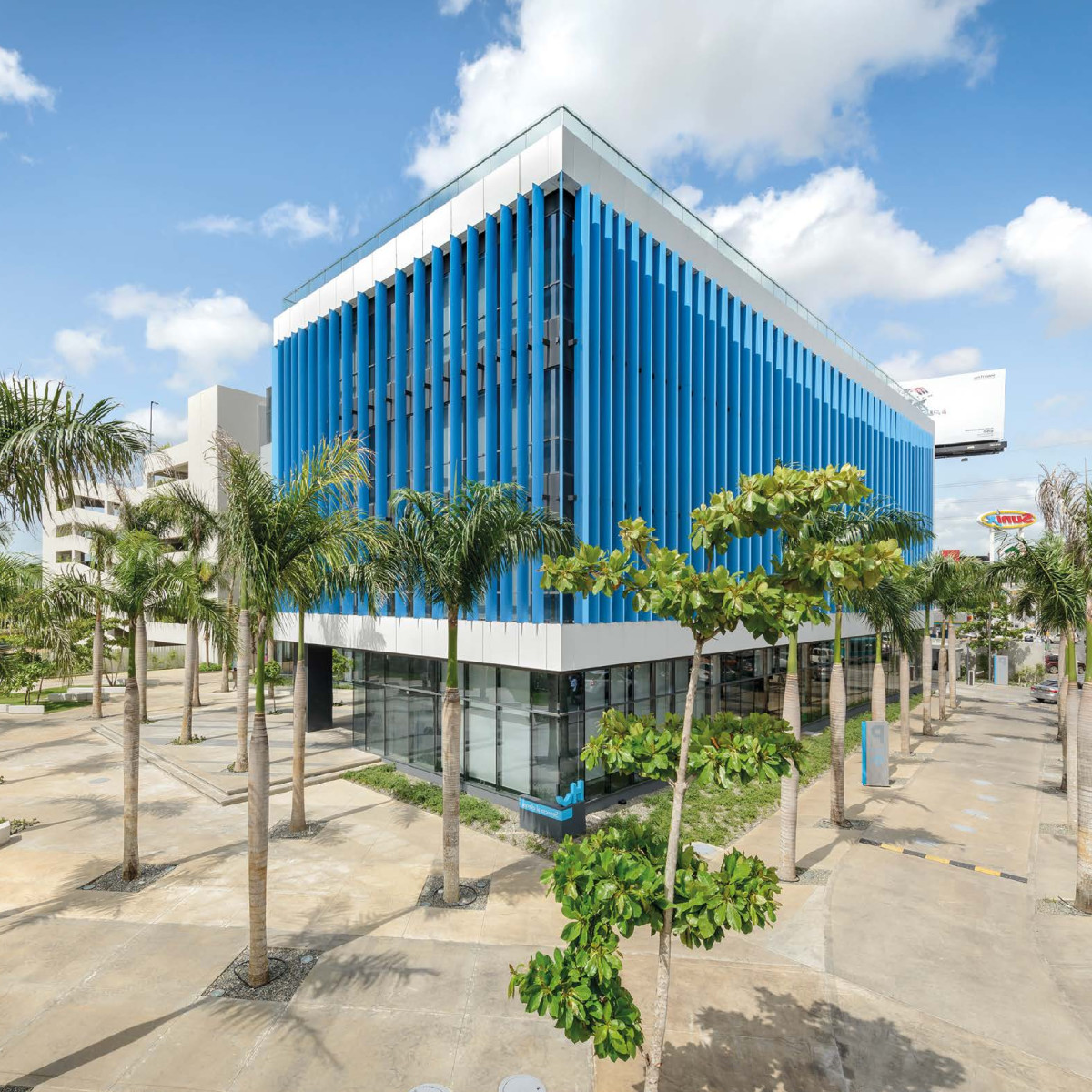 La fachada responde a un lenguaje contemporáneo combinando el uso de muros cortinas para entrada de luz natural y los quiebrasoles con el color de la identidad de la marca que sirven de protección al fuerte sol del Caribe.