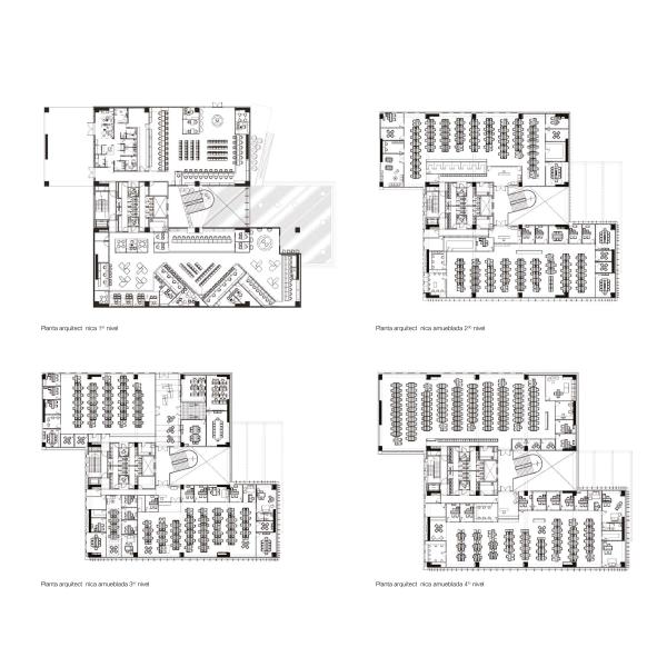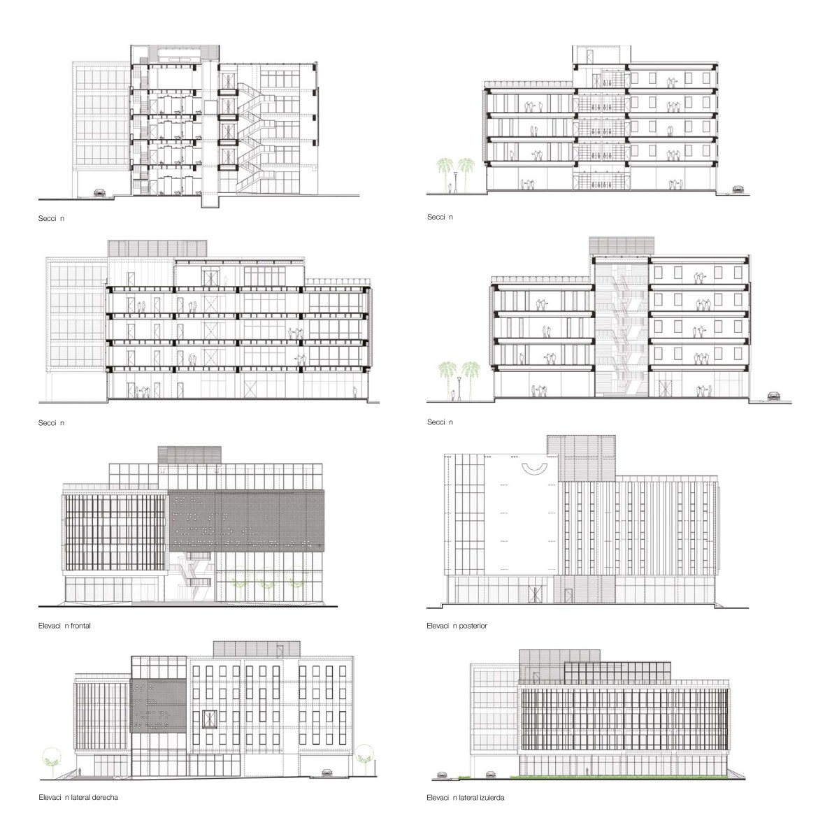 A través de la rampa interna de doble vía se comunica con el resto de los niveles. Los niveles 2,3, 5 y 6 con 60 parqueos cada uno. El Nivel 4, se ha concebido con un tratamiento exterior de jardín creando un interesante quiebre en su volumetría. En este nivel se ubican 59 parqueos. El Nivel 7 y azotea poseen 63 parqueos para un total de 408 parqueos en este edificio.
