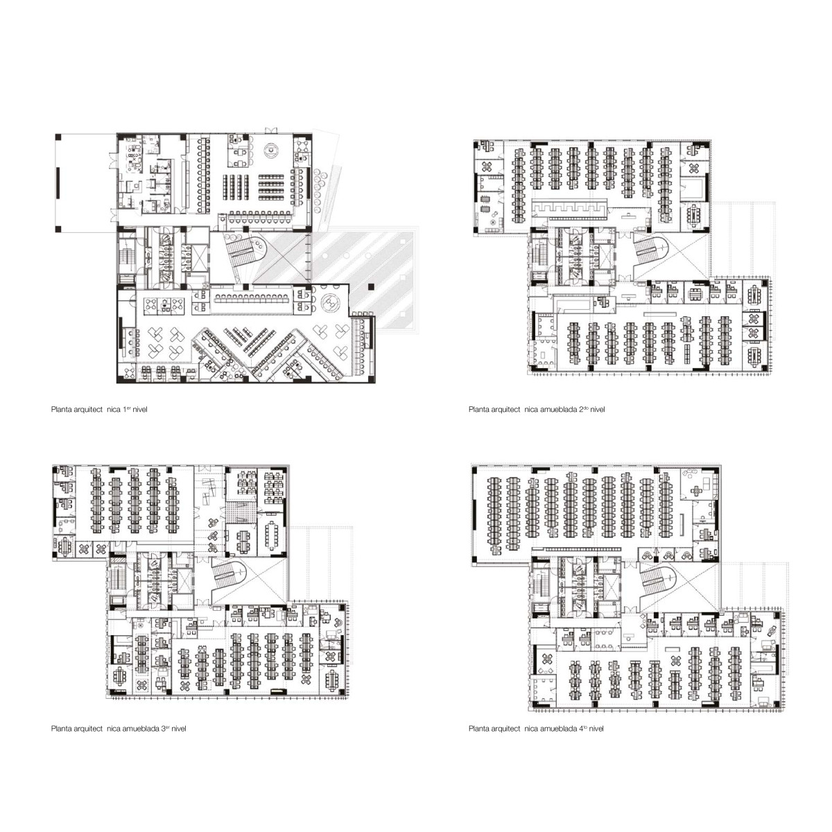 Se compone de dos volúmenes rectangulares de cinco niveles orientados norte-sur, con 1200 m2 por nivel. Ambos bloques se conectan a través de un núcleo de servicios donde se encuentran las escaleras, los ascensores, montacargas, baños y espacios para equipos y mantenimiento.