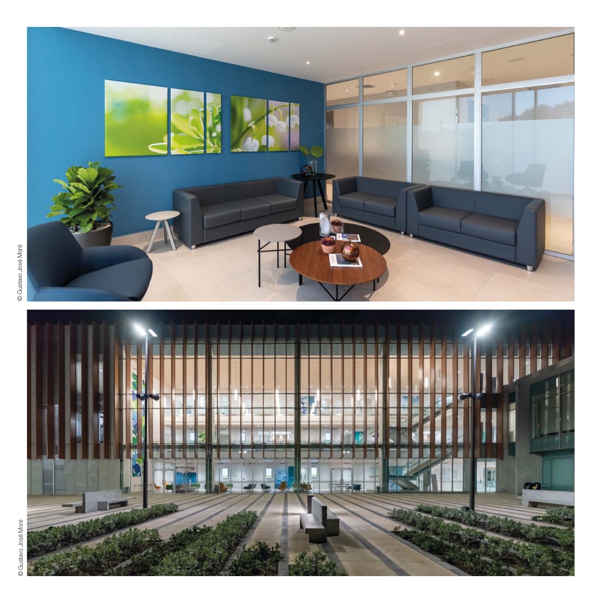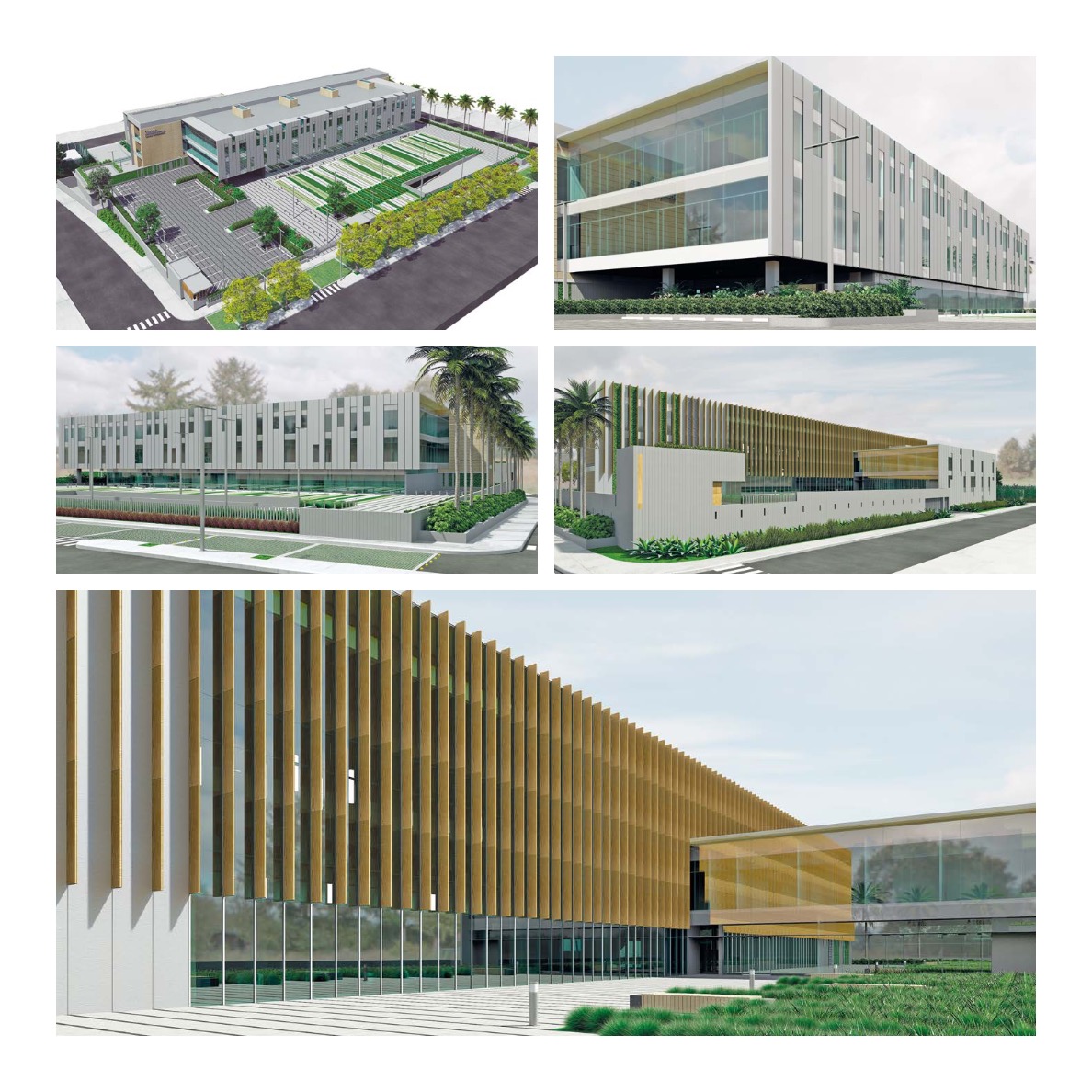 La plaza frontal, controlada al público, distribuye estacionamientos para visitantes, y permite un acceso cubierto a manera de marquesina hasta la entrada principal, que se ha situado retirada del borde frontal oeste de la propiedad por razones de control ambiental, futura expansión y de jerarquización urbanística. Esta localización de la estructura en el sentido norte sur, cuya construcción ha sido totalmente prevista en hormigón armado, propone fachadas respectivamente enfrentadas al este y al oeste, tratadas acordes al comportamiento y control climático que han de asumir. La fachada oeste, más expuesta al asoleamiento vespertino, se cubre de paneles de hormigón prefabricados colgados verticalmente de los entrepisos. La fachada este, hacia la que se vierten las áreas públicas y el atrio de circulación de la operación, es mucho más transparente, y está definida por un muro cortina de aluminio y vidrio a doble altura, protegido por quiebrasoles especialmente diseñados siguiendo el módulo de 1 metro, que estructura y gobierna toda la geometría del conjunto, tanto paisajística como arquitectónica y estructuralmente.