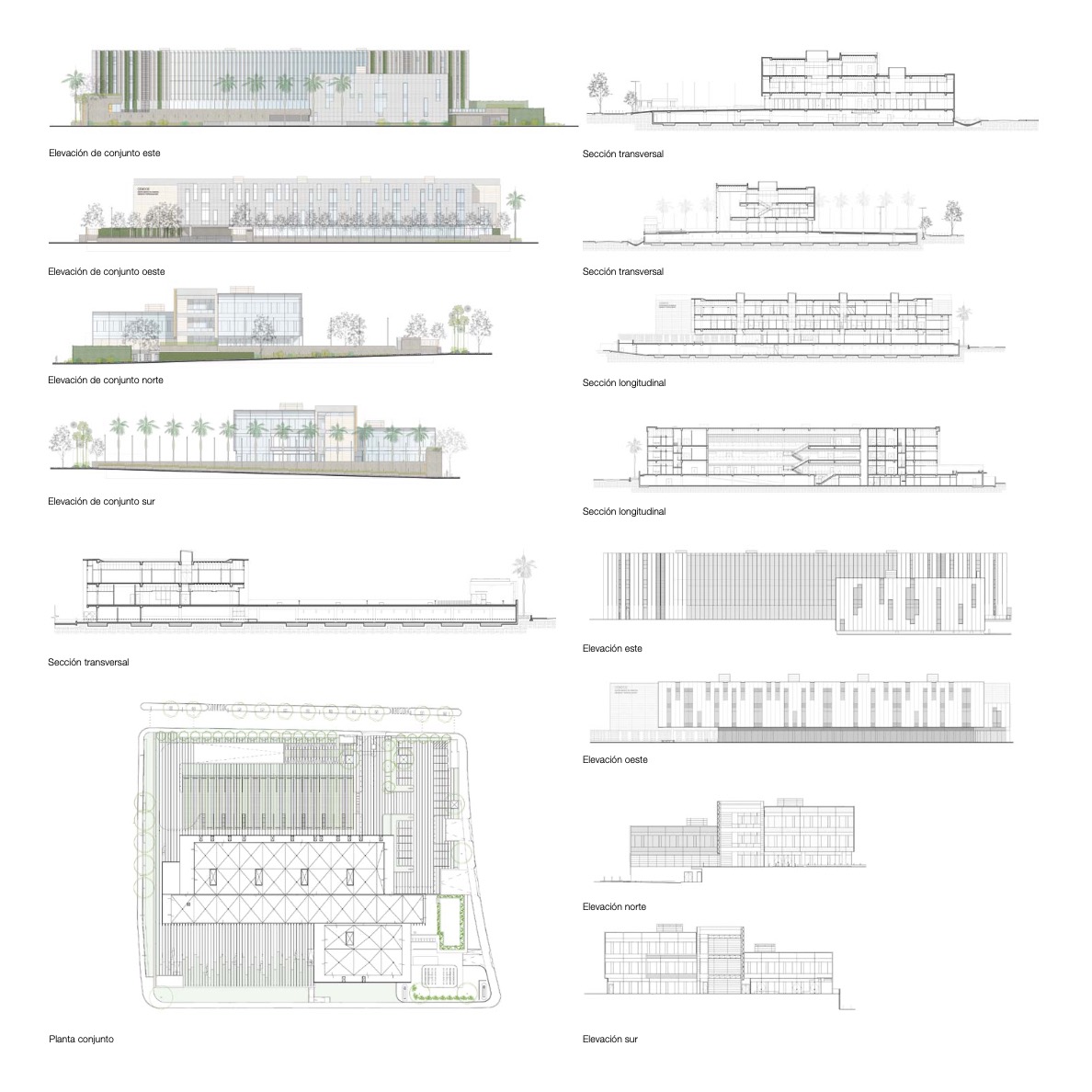 Otro bloque de escaleras y servicios -mecánicos, eléctricos, sanitarios-equilibra los requerimientos del centro, en el extremo sur del conjunto.
