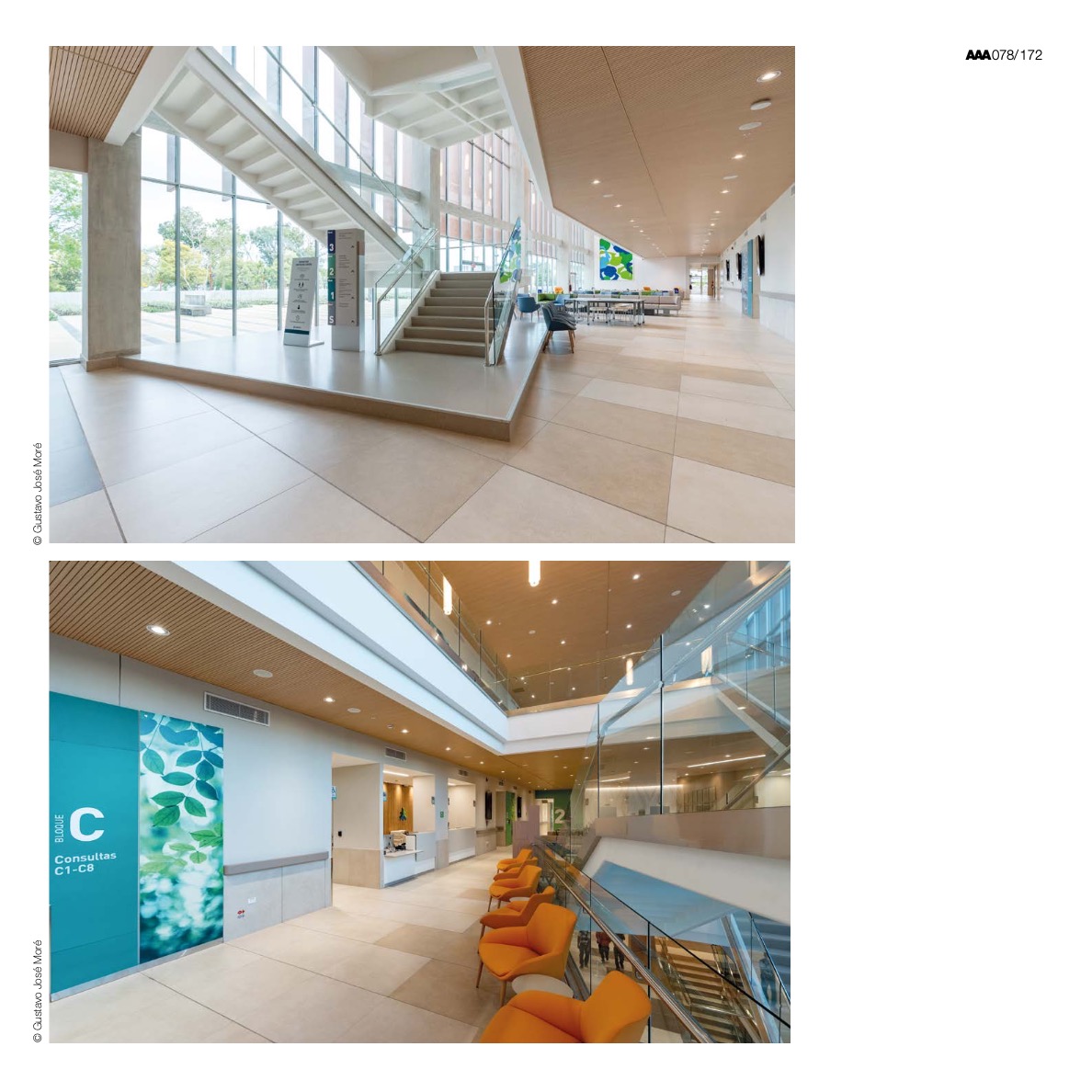 Las zonas de empleados, cocina y lavandería se articulan con discreción en la planta que dispone de accesos desde el semisótano de servicios, en el bloque formado por el lado corto de la “L”. El bloque principal trabaja con despachos, consultorios y áreas administrativas volcadas a través de una vidriera de seguridad sombreada, mirando a la plaza, al oeste; y el piano nobile del atrio de integración vertical del edificio, expuesto al este. Una agradable zona comunitaria de espera, se distribuye en esta crujía escalonada en los pisos superiores.