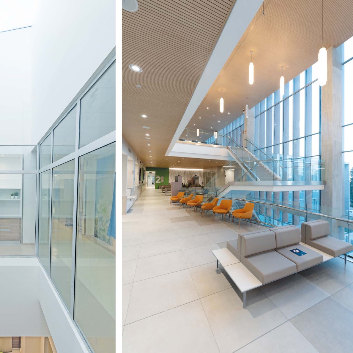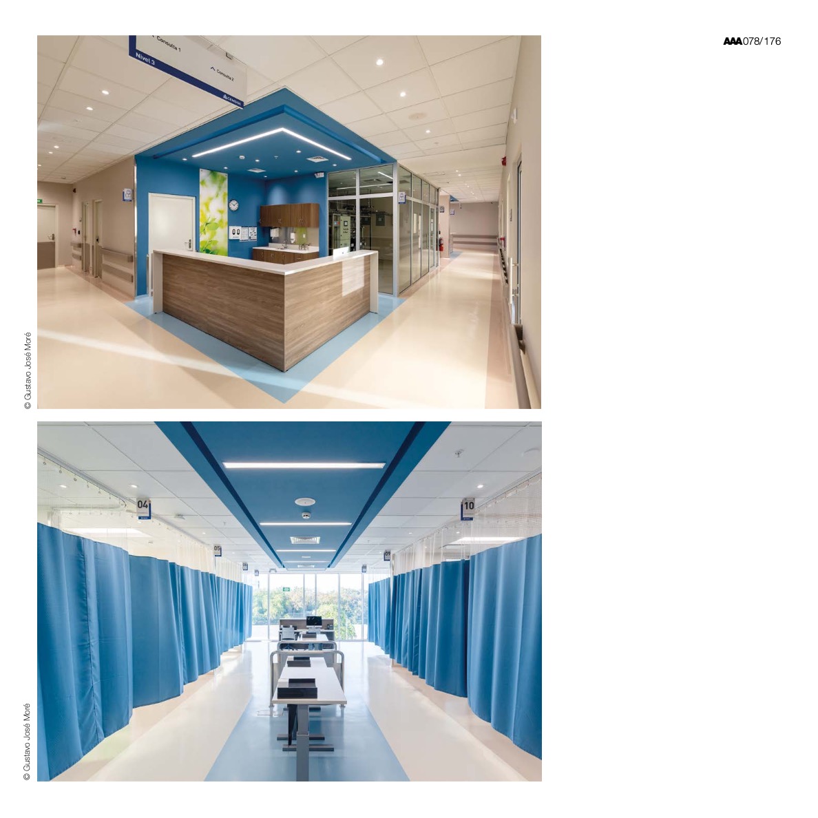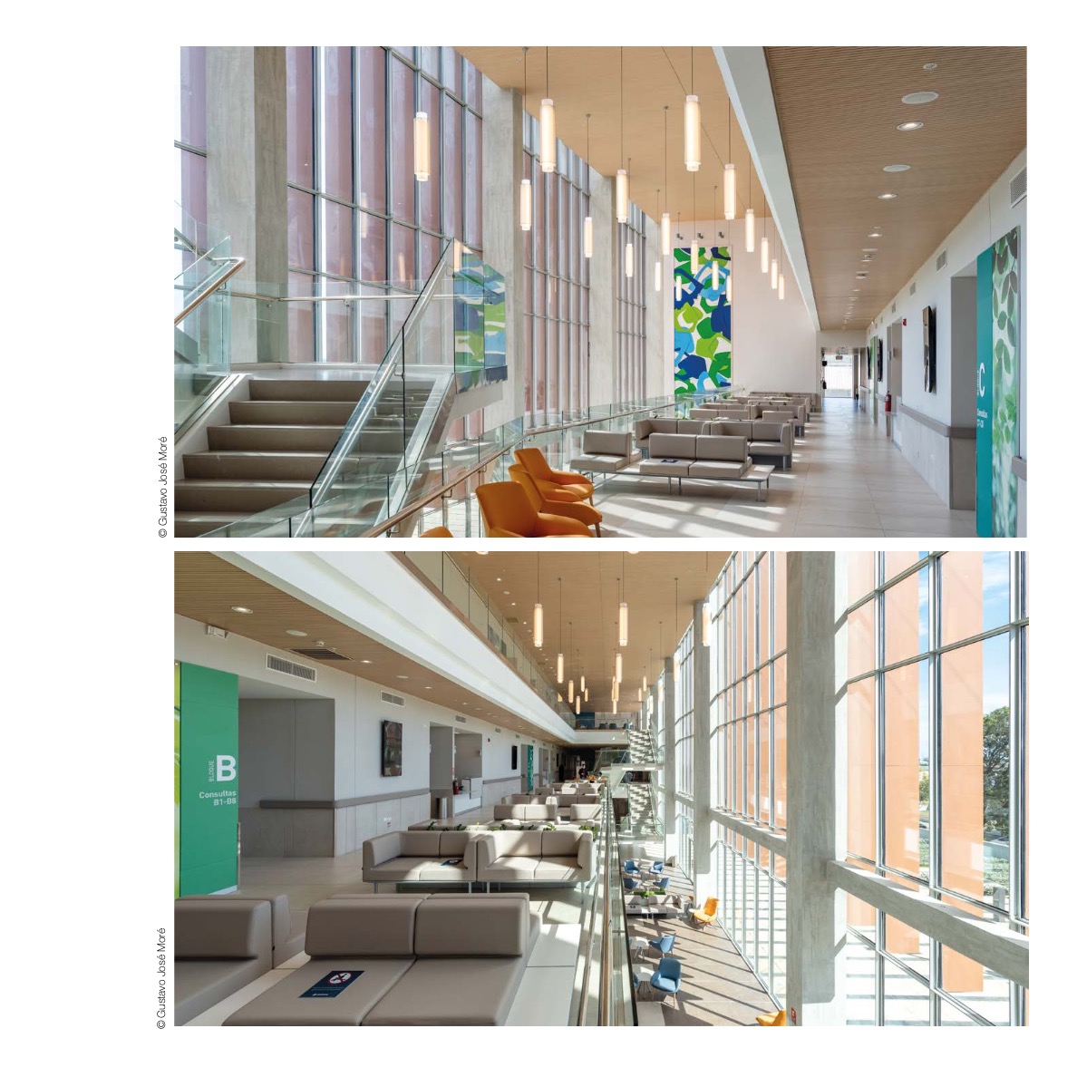 De igual manera, el segundo nivel se dispone en dos bloques longitudinales, norte sur: hacia el este, un corredor de circulación, más estrecho que el del primer nivel, se asoma al atrio; y hacia el oeste, los espacios de consultorios médicos, de control de pacientes, tratamientos, salas especializadas, etc., se distribuyen tipo peine, con circulaciones públicas desde el vestíbulo longitudinal este, y circulaciones internas privadas, paralelas al plano de la fachada oeste; la gran mayoría de los espacios útiles se colocan hacia el centro de la planta, creando así ambientes climática e higiénicamente controlados.