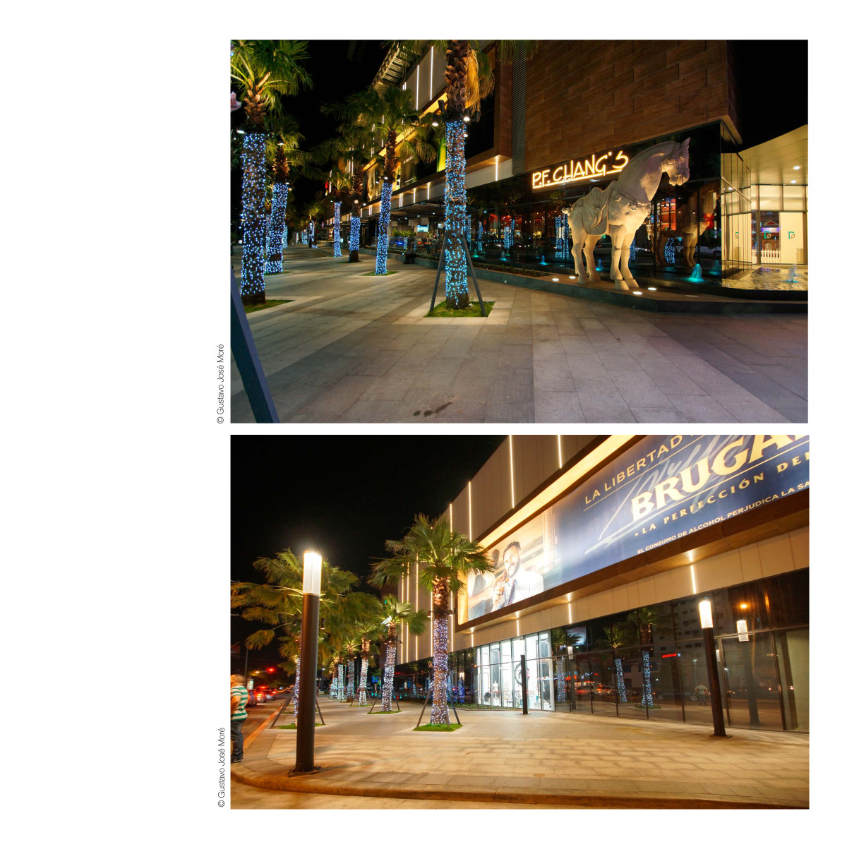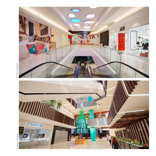 El proyecto cuenta con un centro comercial de 70 locales, una torre empresarial de 11 niveles de oficinas y 1000 estacionamientos localizados en tres niveles soterrados. El centro comercial cuenta con dos accesos principales: desde la avenida Núñez de Cáceres y desde la avenida Rómulo Betancourt. El primer nivel cuenta con tres restaurantes con terrazas hacia la calle; el Supermercado Carrefour y gran variedad de locales comerciales. En el segundo nivel se localizan doce salas de cine — siendo el cine más grande del Caribe, con servicios y tecnología 4DX única en el país—, el foodcourt, un área de niños, y algunas tiendas. El tercer nivel incluye tres salas de cines VIP & lounge, locales comerciales y el Gimnasio Smart Fit. Cada nivel cuenta con baños públicos y áreas de servicios, y tres núcleos de ascensores y escaleras (independientes de las de servicios) para la circulación vertical, ubicados estratégicamente para cada área o zona. El ascensor del centro comercial tiene vista panorámica al atrium central, del primero al tercer piso.