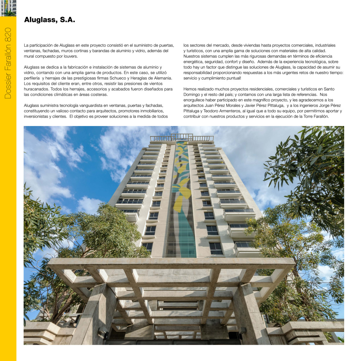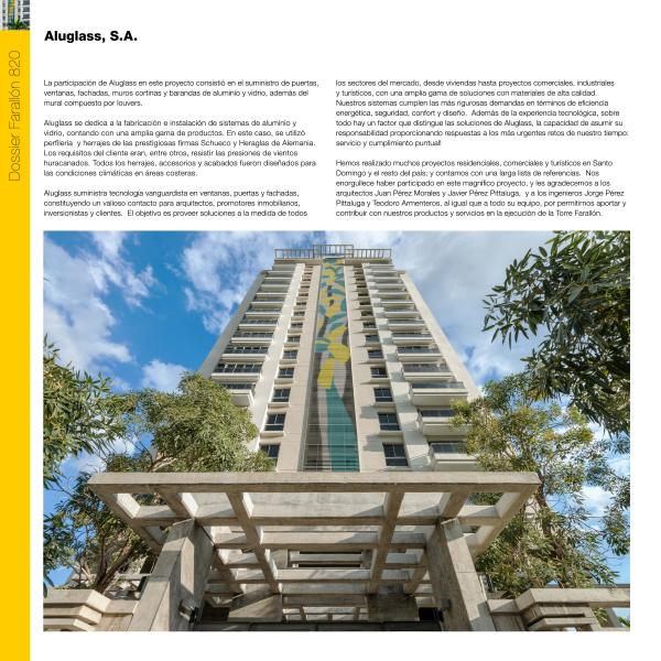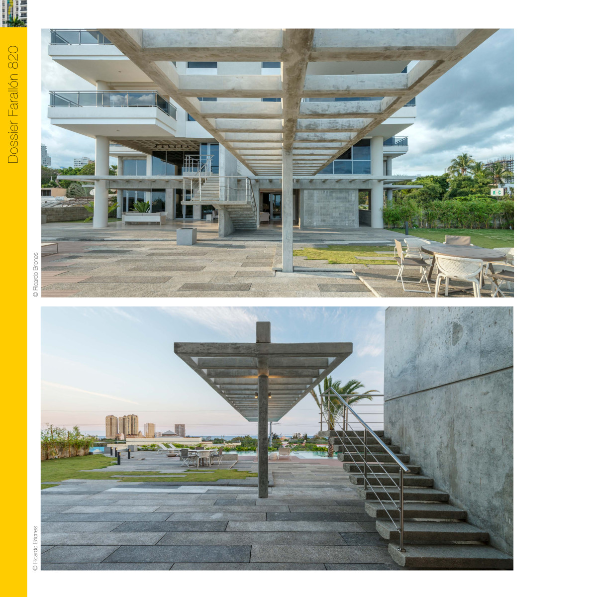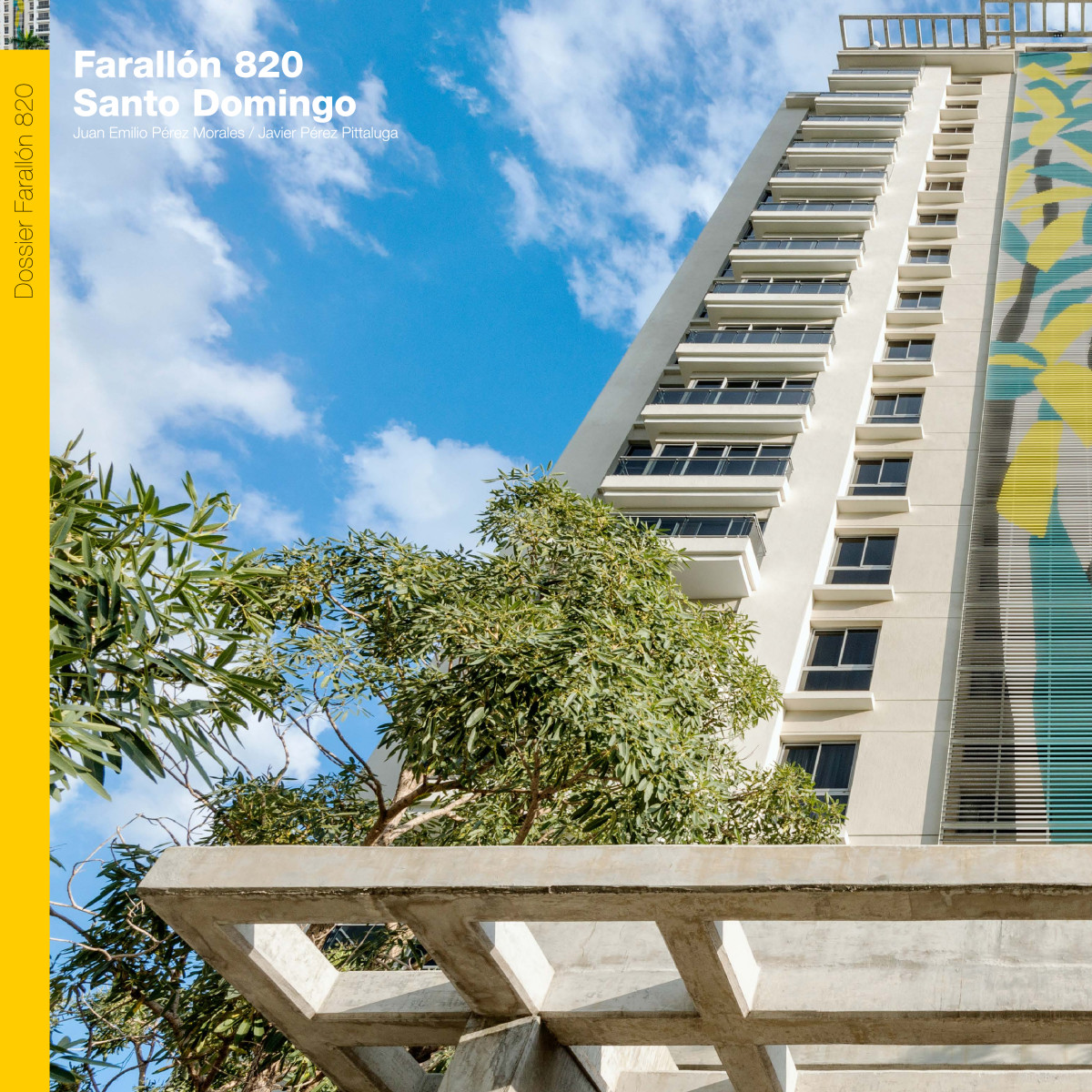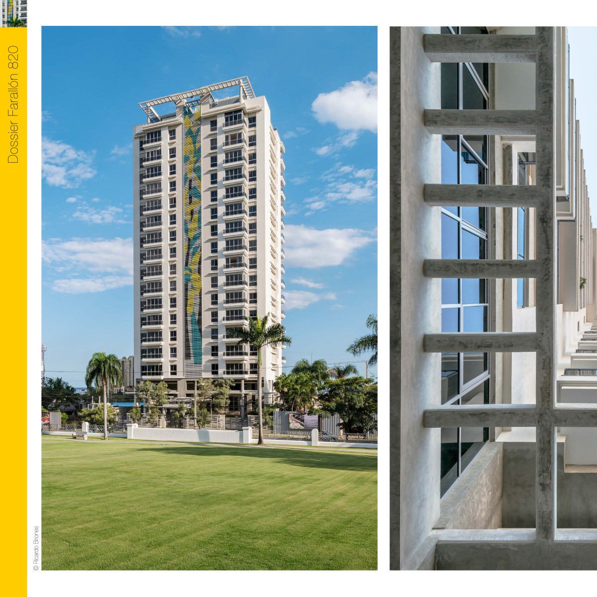De líneas sobrias y elegantes, la torre se distingue por el uso del hormigón, manejado en toda su expresividad en los primeros niveles, con elementos ortogonales que marcan los accesos y circulaciones a las áreas sociales. El cuerpo de la torre repite el diseño tipo con mínimas variaciones, protagonizando los balcones y terrazas en las fachadas sur y norte; con un coronamiento pergolado en hormigón que sirve de contrapartida a los del primer y segundo nivel. El elemento protagonista de la fachada de Farallón 820, es la inclusión de un majestuoso mural pictórico de la artista dominicana Amaya Salazar, donde destaca el cromatismo de la flora antillana. El arte y la arquitectura se unen conviertiendo esta estructura en arte urbano permanente.