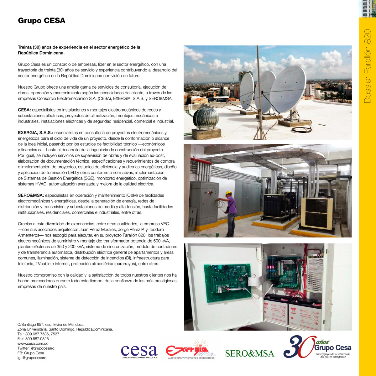 Farallón 820 cumple con todos los códigos sísmicos del Sistema de Códigos de Construcción de la República Dominicana, y cumple con los códigos internacionales del American Concrete Intitute (ACI). Además, el proyecto cuenta con productos de la más alta calidad, entre ellos cocinas Venetta Cucine, puertas españolas Portadez, ventanas doble vidrio anti-ciclónicas alemanas Shueco, muebles de baño Mastela, mezcladoras Hansgrohe, inodoros y lavamanos TOTO, y equipos de aires acondicionados LG de alta eficiencia —lo que representa un ahorro de un 50-65% de energía con relación a los equipos tradicionales.
