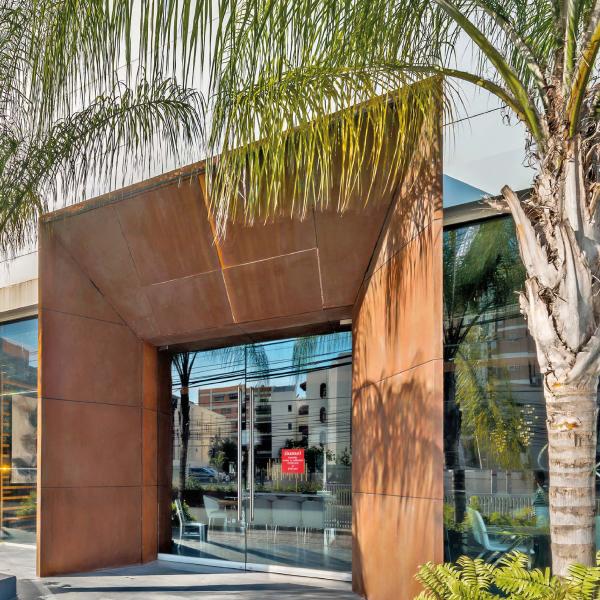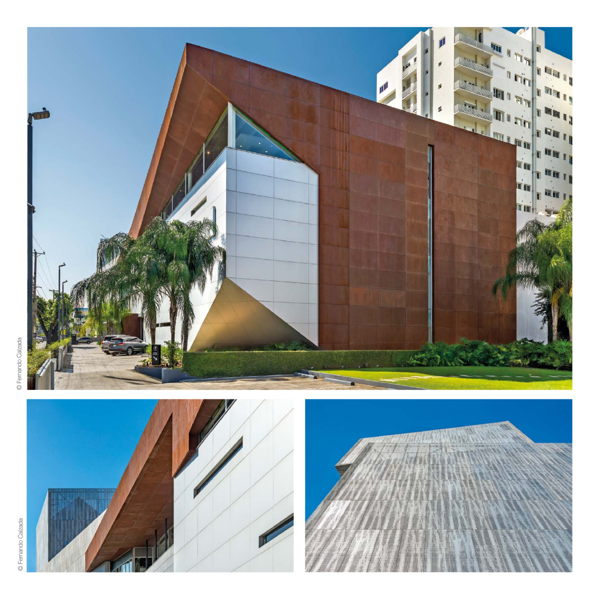 Hacia la Avenia Abraham Lincoln, con un frente de 2,120 m2, se implementa una piel translúcida y con presencia, iluminada en las noches, enriqueciendo la imagen del Polígono Central. Paneles troquelados de aluminio anodizado, modelados y armados a la medida, sostenidaos por una estructura metálica, han sido diseñados para que sea parte de la composición de la fachada frontal.