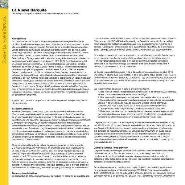 El sector La Barquita, considerado como un sub-barrio de San Lorenzo de Los Mina, ubicado en el borde del litoral este del río Ozama, en Santo Domingo Este, es un ejemplo del descontrol de la ocupación informal y acelerada del suelo. La inexistencia de una clasificación primaria de suelo y la falta de regulaciones catastrales y territoriales han producido un estado de ilegalidad general de la propiedad, condiciones de infravivienda y hacinamiento humano y urbano sin infraestructuras de servicios básicos. Esta situación agudiza el problema de contaminación del río, siendo receptor de las aguas servidas y desechos que son vertidos directamente desde las comunidades contiguas. La construcción descontrolada sobre el borde fluvial genera un estado progresivo de degradación ambiental y eleva el estado de riesgo de las comunicadas ubicadas en ella.