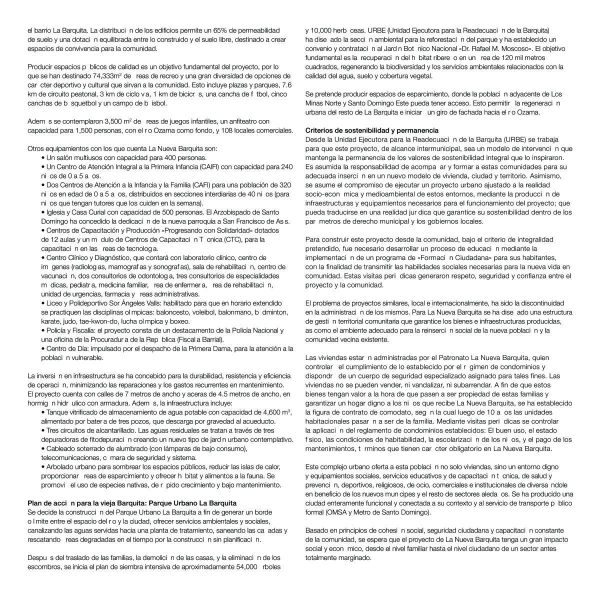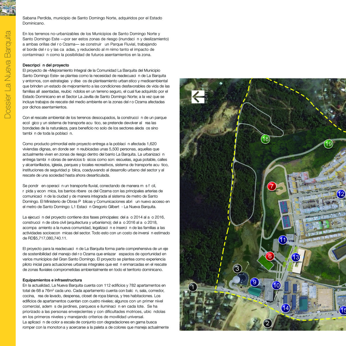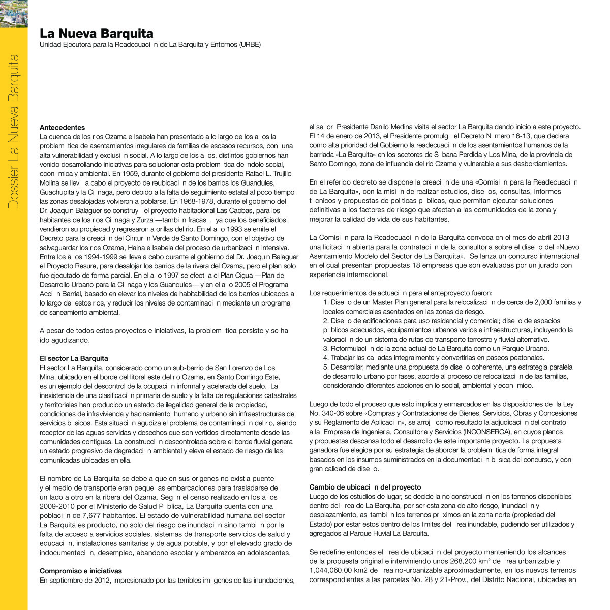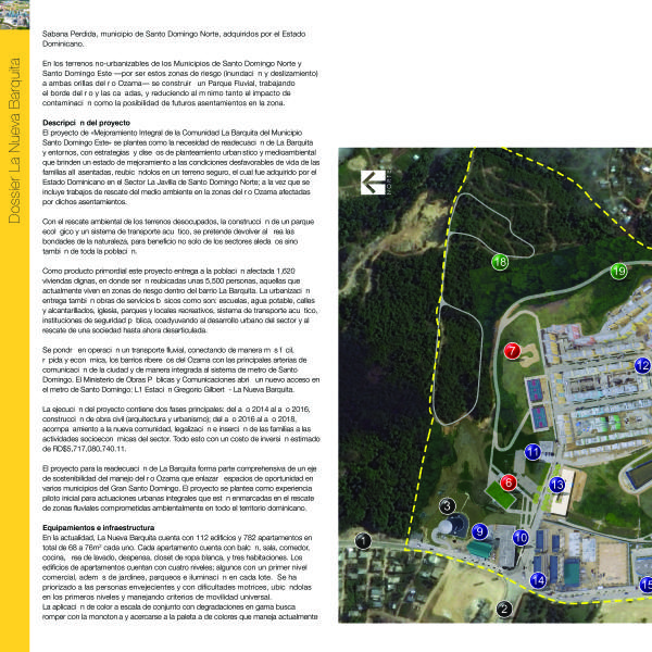 El proyecto de «Mejoramiento Integral de la Comunidad La Barquita del Municipio Santo Domingo Este» se plantea como la necesidad de readecuación de La Barquita y entornos, con estrategias y diseños de planteamiento urbanístico y medioambiental que brinden un estado de mejoramiento a las condiciones desfavorables de vida de las familias allí asentadas, reubicándolos en un terreno seguro, el cual fue adquirido por el Estado Dominicano en el Sector La Javilla de Santo Domingo Norte; a la vez que se incluye trabajos de rescate del medio ambiente en la zonas del río Ozama afectadas por dichos asentamientos.